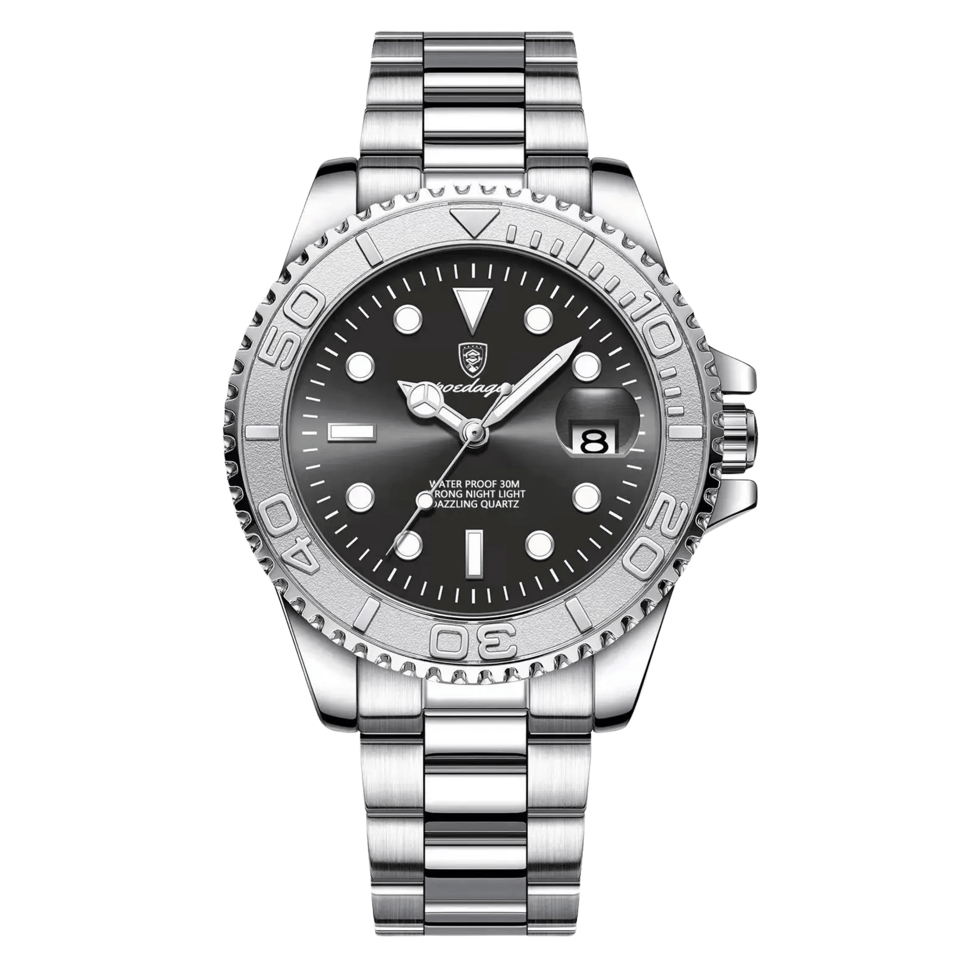 O Relógio Masculino Series Submariner é a combinação perfeita entre elegância clássica e robustez esportiva. Inspirado nos lendários relógios de mergulho, seu design imponente traz um mostrador detalhado com marcadores luminescentes, moldura giratória unidirecional e acabamento em aço inoxidável de alto brilho.